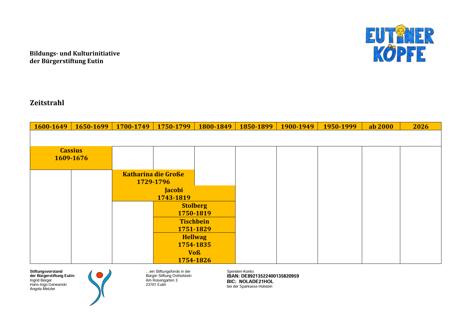 Die Arbeitsgruppe der "Bildungs- und Kulturinitiative Eutiner Köpfe" hat sich schon seit 2019 sehr intensiv mit den Persönlichkeiten beschäftigt, die in Eutin geboren sind oder hier gewirkt haben und die weit über Eutin hinaus bekannt geworden sind. Dabei sind viele Informationen zusammengekommen. Es geht dabei um große – aber auch kleine Begebenheiten und Geschichten/ Anekdoten. Ziel ist es, das Wirken in Eutin darzustellen und dem Besucher näherzubringen.